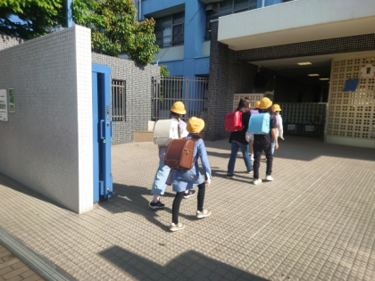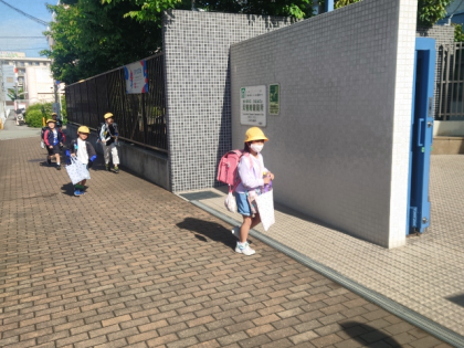 今日は、PTA会長が正門で子どもたちの登校を見守っておられました。