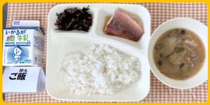 今日の献立は、あかうのしょうゆだれかけ・豚汁・ひじきのいため煮・ごはん・牛乳でした。