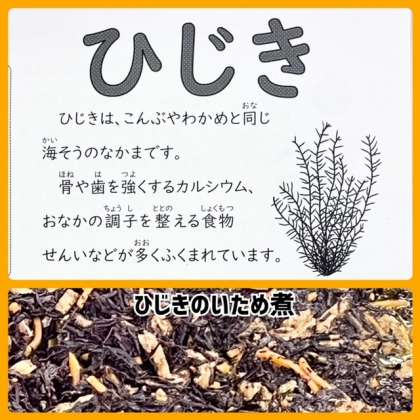 「ひじきのいため煮」は、ひじきとうすあげ、にんじんを砂糖とこいくちしょうゆで味つけしたいため煮です。食物繊維、カルシウムを多く含むひじきは、すすんで食べてほしい食材のひとつです。今日は、約800gの乾燥ひじきを使用しています。