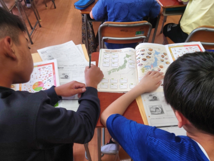 家庭科の時間は、食品を「赤」「黄」「緑」の3グループに分けた表を見ながら、栄養バランスのよい朝食のおかずを考えました。