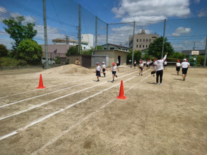 体育科の時間は、体力テストの50m走の種目の練習をしています。