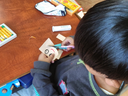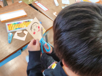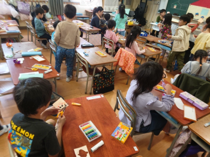 図工科の時間は、パスで顔を描いて、折り紙を折ってつくったかぶとをかぶせて、画用紙のおうちに貼っていきます。