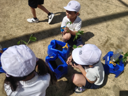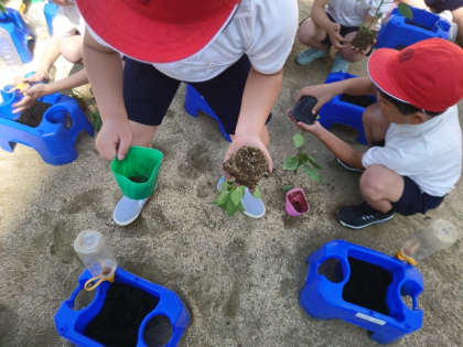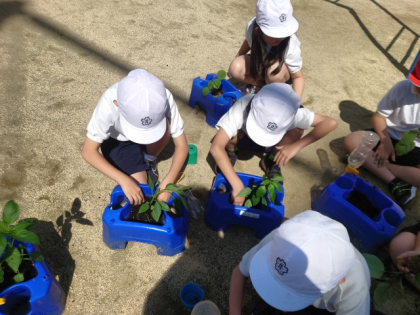 生活科の時間は、1年生のときにアサガオを育てた鉢を使って、今年はえだまめ、ししとう、おくら、ミニトマト、ピーマンなどの野菜を植えました。