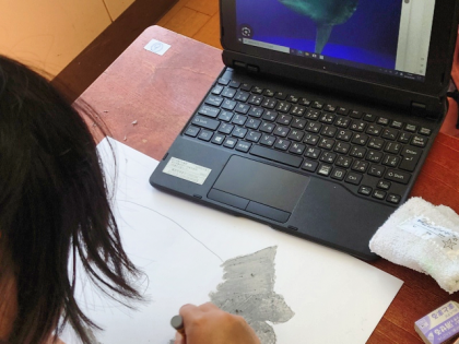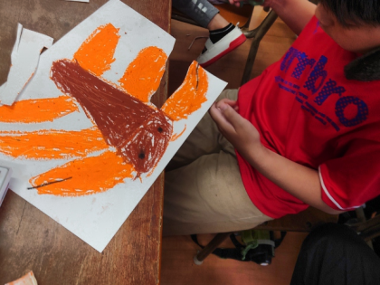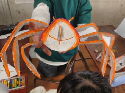 教室では、子どもたちが海遊館で見た海の生き物たちを思い出して、パスなどを使って絵を描いています。