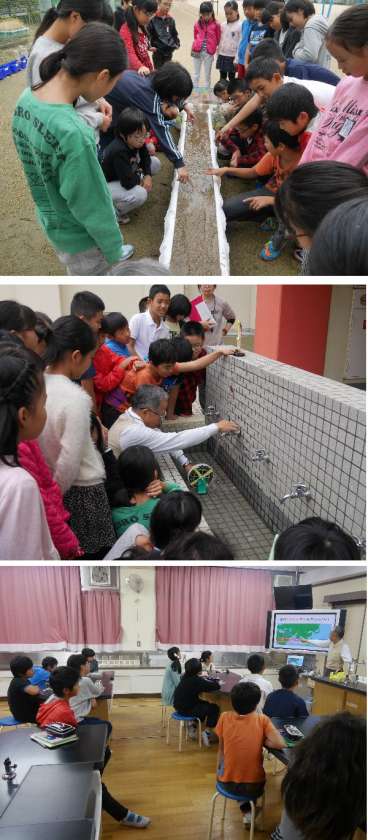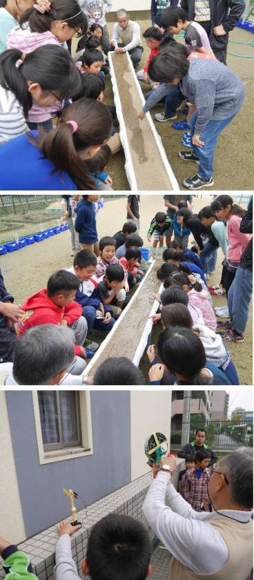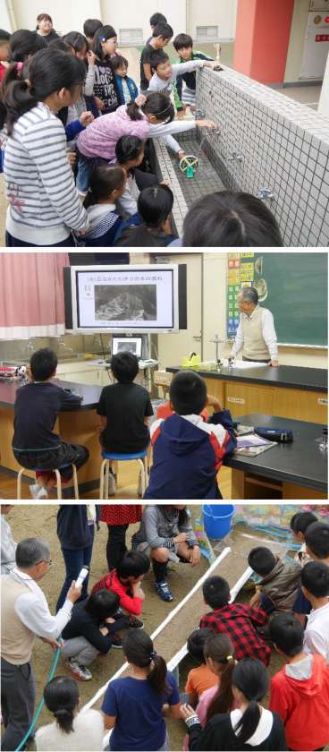 5年生の理科の授業に、出前授業に外部からきていただき、理科特別授業をおこなっていただきました。「流れる水の働きを知ろう」と実際に大掛かりな実験装置をもってきていただき、水を流してみて土砂がどうなるか実験していただきました。理科室でもビデオなどを見て学習しました。