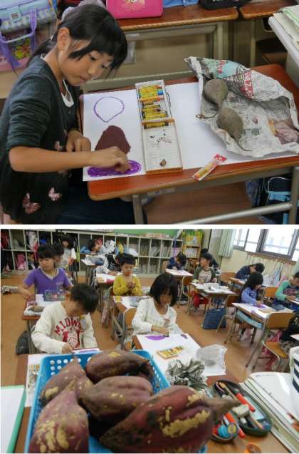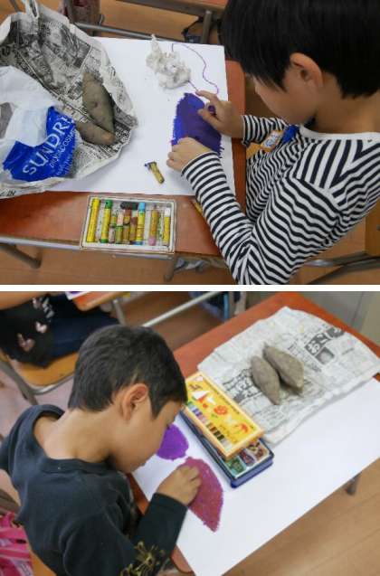 2年生がサツマイモの絵をしっかり観察して描いていました。