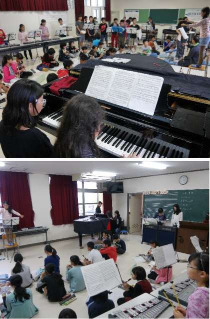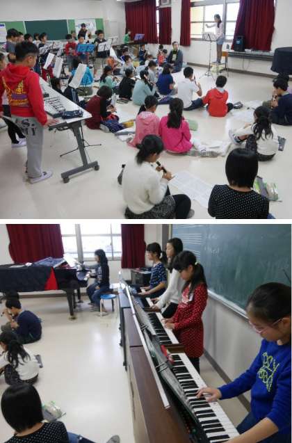 5年生の音楽の時間です。全5年生が集まって合奏をしています。音楽発表会にむけてがんばっています。