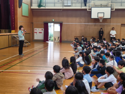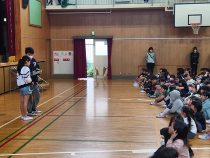 校長講話のあと、担当から今月のめあて「ろうか・階段は右側を歩こう」について子どもたちに話をしました。