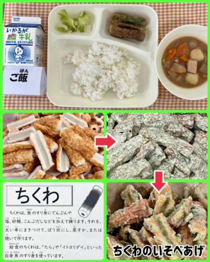 今日の献立は、ちくわのいそべあげ・あつあげとさといものみそ煮・あっさりキャベツ・ごはん・牛乳でした。