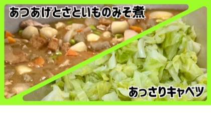「あつあげとさといものみそ煮」は、あつあげとさといもの他に、鶏肉、つなこんにゃく、たまねぎ、にんじん、青みにむきえだまめを使用し、砂糖、こいくちしょうゆ、赤みそで味つけして煮含めています。