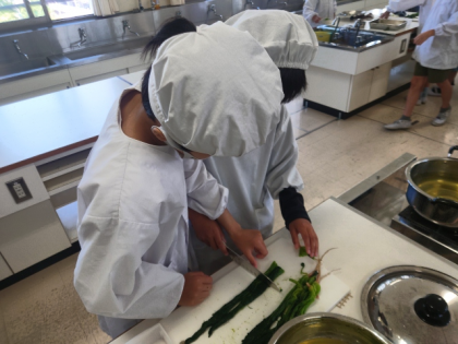 家で料理をする経験が少ない子どもたちは、慎重にほうれん草をゆでたり、切ったりしていました。