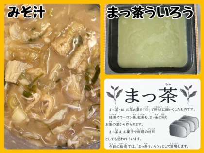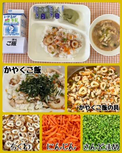 今日の献立は、かやくご飯・みそ汁・まっ茶ういろう・牛乳でした。