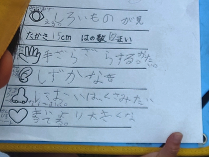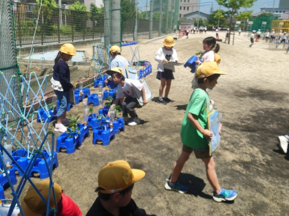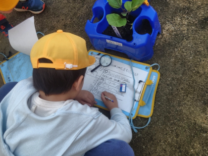 生活科の時間は、先日自分たちが植えたミニトマトやナスなどの野菜を観察して、ワークシートに記録しています。