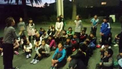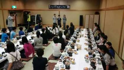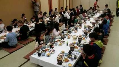 避難訓練をして、あの有名な夕食です。いただきますをして、元気に食べています。