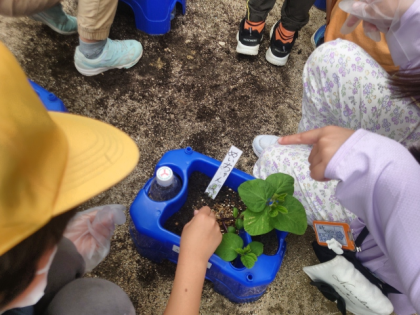 生活科の時間は、えだまめ、ししとう、おくら、ミニトマト、ピーマンなどの野菜に肥料をあげました。