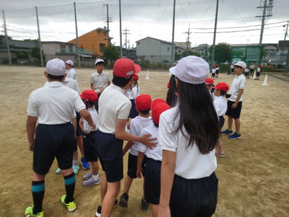 50m走では、どのように走ればよいのか、6年生がやさしく教えていました。