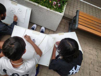 図工科の時間は、中庭に咲いている花をスケッチしました。