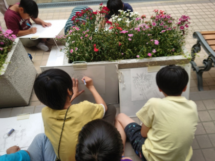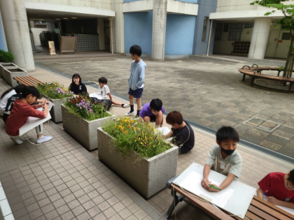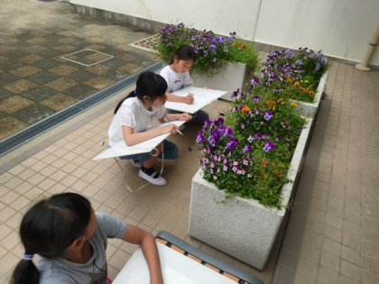 図工科の時間は、中庭に咲いている花をスケッチしました。