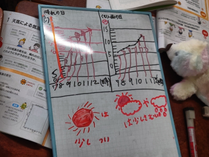 理科の時間は、1日の気温の変化は、晴れの日とくもりや雨の日では、どのようにちがうのか、グループで予想しました。