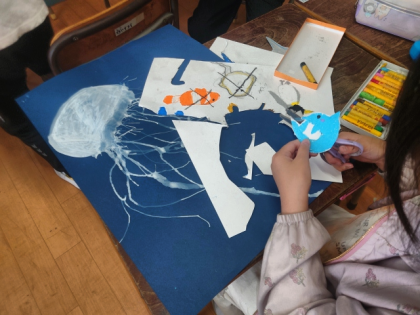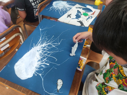 図工科の時間は、子どもたちが海遊館で見た海の生き物たちを思い出して、パスや絵の具などを使って絵を描いています。