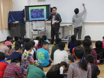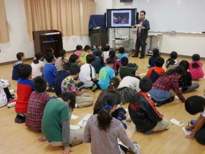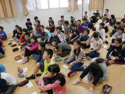 5年生が校外学習で、万博記念公園・国立民族博物館にでかけます。その説明が行われています。地下鉄と阪急で行きます。万博公園ではオリエンテーリング、博物館では調べ学習をおこないます。集合時間が朝7時50分で早いので遅れないようにね。