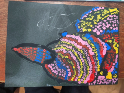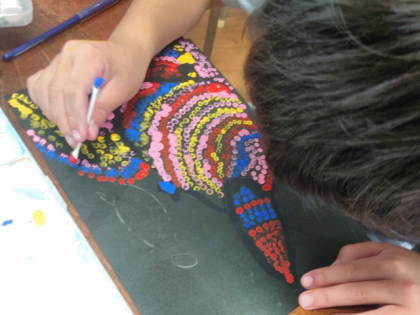 図画工作科の時間は、多くの小さな点を使って絵を描く「アボリジニアート」の作品を制作しています。