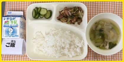 今日の献立は、ホイコウロー・中華スープ・きゅうりのピリ辛あえ・ごはん・牛乳でした。