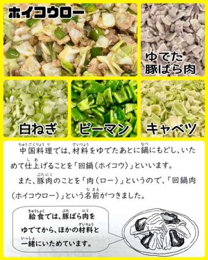 「ホイコウロー」は、よくゆでて料理酒で下味をつけた豚肉(ばら)を主材に、キャベツ、ピーマンを使用したいためものです。しょうが、にんにく、白ねぎで風味を加え、テンメンジャン、砂糖、塩、こいくちしょうゆを合わせた調味液で味つけしています。