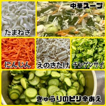 「中華スープ」は鶏肉、たまねぎ、にんじん、えのきたけ、青みにチンゲンサイを使用し、塩、こしょう、うすくちしょうゆ、中華スープの素で味つけしています。