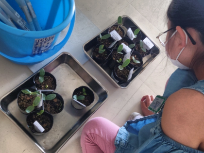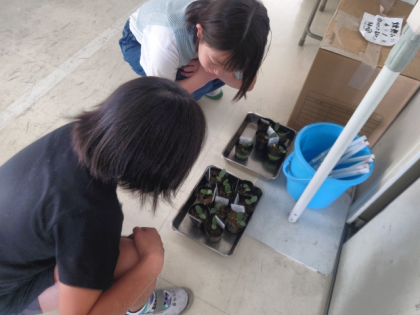 休み時間に、4年生の子どもたちが、自分たちが植えたへちまとひょうたんを観察しています。