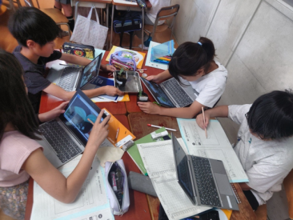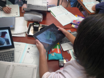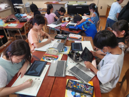 学習用端末でへちまとひょうたんを撮影し、ワークシートに絵と文章で記録しています。