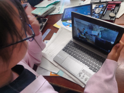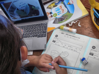 学習用端末でへちまとひょうたんを撮影し、ワークシートに絵と文章で記録しています。