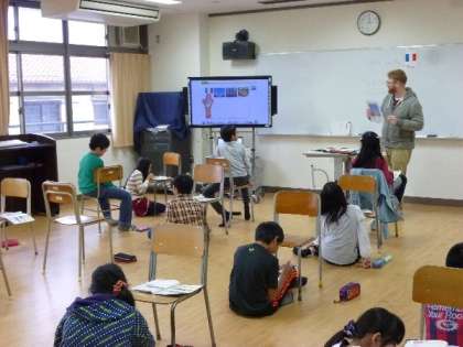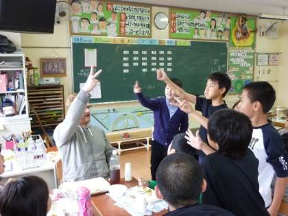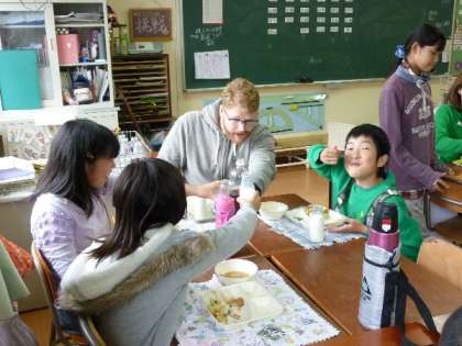 毎週、中学校から英語の授業のためにメイソン先生がきてくれています。今日は6年生の教室で給食です。