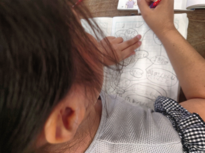 今日は、クラスの友達に自分のことをもっと知ってもらうために、自分の好きなことや得意なこと、苦手なことや直したいと思っていることなど、自分について考えたことをノートに書き出しました。