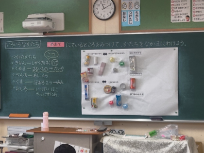 算数科の時間は、いろいろな形の箱を集めて「はこの かたち」「つつの かたち」「ぼおるの かたち」の仲間に分けました。