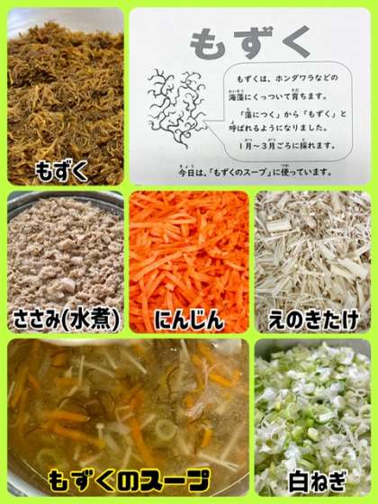 「もずくのスープ」は、流水解凍したもずく、にんじん、白ねぎ、えのきたけを使った汁物です。今回はさらに、旨みを増すため、ささみ(水煮)を加えています。