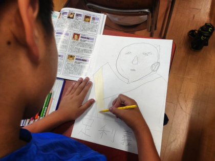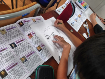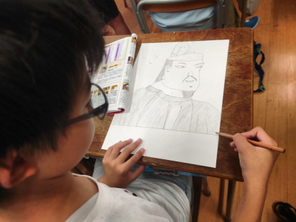 社会科の時間は、資料集を見ながら、歴史学習で学ぶ人物の絵を描きました。