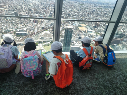 ハルカスの展望階から、大阪のまちのようすを調べています。