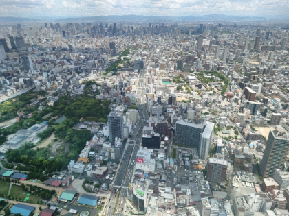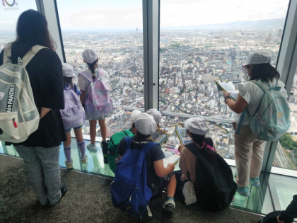 ハルカスの展望階から、大阪のまちのようすを調べています。