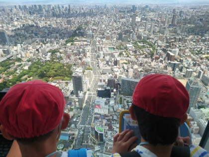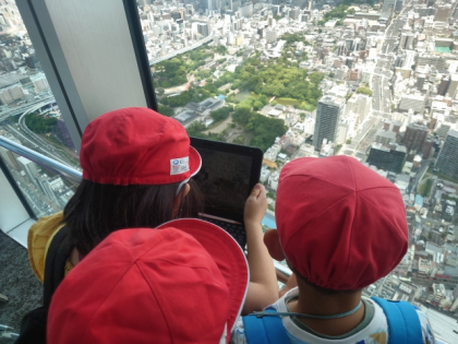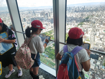ハルカスの展望階から、大阪のまちのようすを調べています。