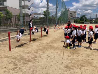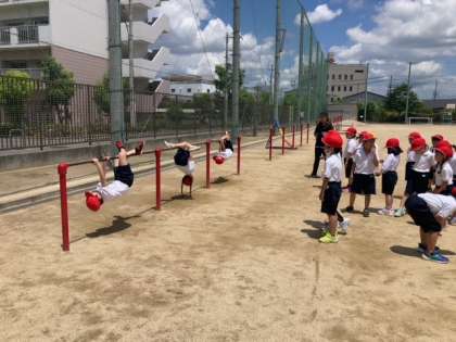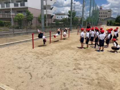 体育科の時間は、並んでいる列ごとに鉄棒ぶら下がりチャレンジをしました。