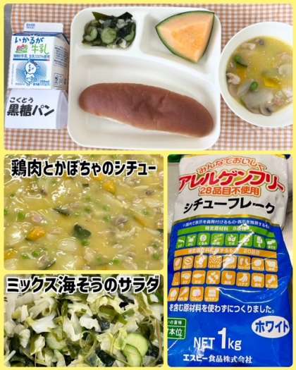 今日の献立は、鶏肉とかぼちゃのシチュー・ミックス海そうのサラダ・クインシーメロン・黒糖パン・牛乳でした。