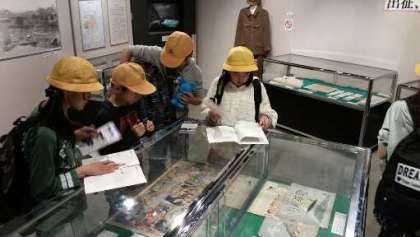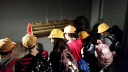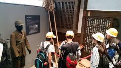 ピースおおさかを見学しています。焼夷弾や防空壕など大阪空襲の写真が展示され、説明されています。