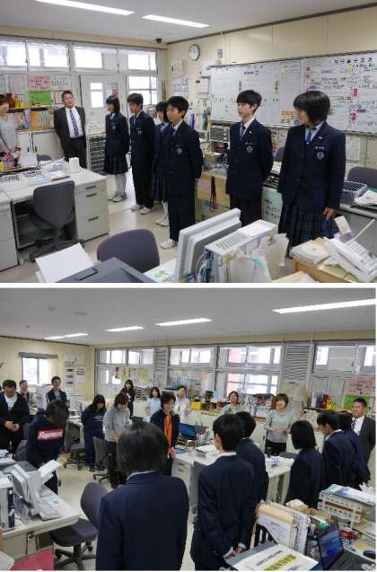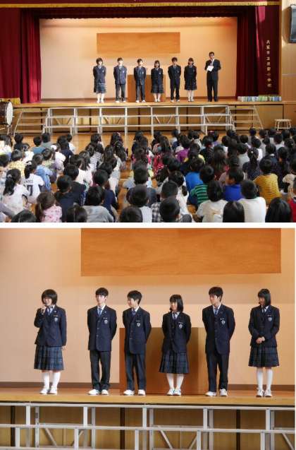 茨田北中学校の2年生6人が焼野小学校で職場体験学習を3日間おこないます。今日は初日ということで、職員室で先生方にあいさつをして、講堂で子どもたちにもあいさつしました。