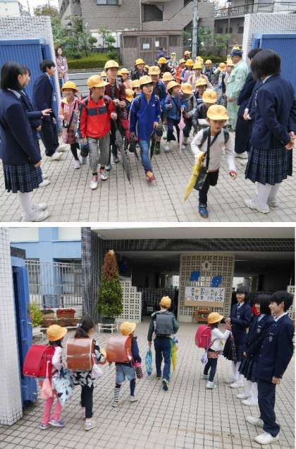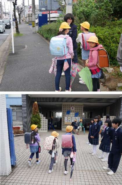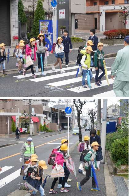 茨田北中学2年生の職場体験学習の2日目です。まず、朝の登校指導からはじまります。子ともたちが登校してくる時間帯に正門や信号のところで子どもたちの様子を見守りながらあいさつしています。