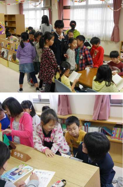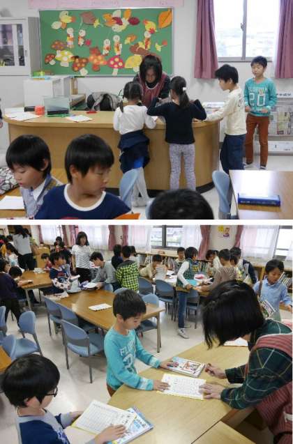 毎週水曜日に図書ボランティアさんが来られることになりました。図書室の開館や図書の修理と整理などにこられます。今日からさっそく20分休みに開館していたたきました。雨だったのでたくさん来てくれました。中学生も本をいっしょに読んでくれています。
