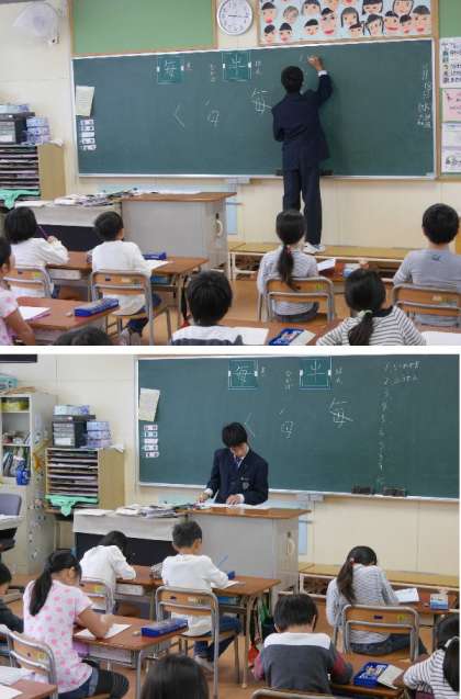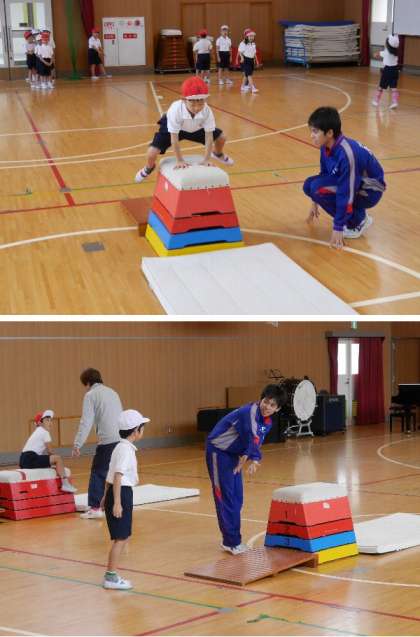茨田北中学2年生の職場体験が各教室でおこなわれています。担任先生のかわりに問題をだしたり、とび箱のとび方を教えたりとがんばっています。