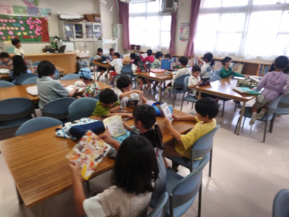 子どもたちが、自分で選んだ本を静かに読んでいます。