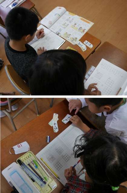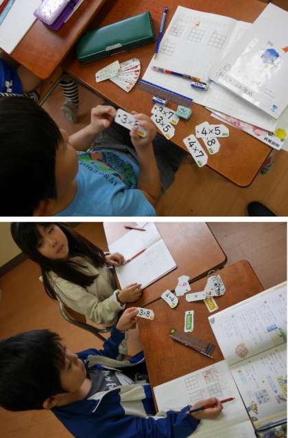 2年生は九九の学習を毎日がんばっています。四角いマス目を作って、九九カードもつかって3と4の段の九九の答えを書き入れます。カードをひいて九九をいって答えをさがしてチェックします。九九を楽しくおぼえてみにつけてほしいですね。