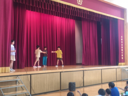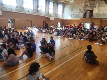 児童集会は、全校児童がドレミ班(たてわり班)で講堂に集まって行いました。